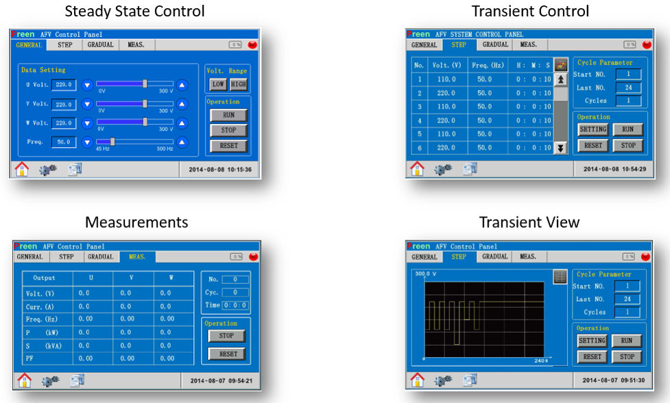 This grid simulator can be controlled by either the touch panel installed on it (the local control) or by the communication channels (eg. RS485) connected to an external computer (the remote control). Either way of control has a user friendly interface which makes controlling and programming this grid simulator much easier than before.