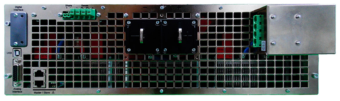 The large LCD touch panel offers a modern and intuitive user interface for controlling the four operating modes, Constant Voltage (CV), Constant Current (CC), Constant Power (CP) and Constant Resistance (CR). Response times for the control via analog or digital interfaces by the DSP controlled hardware are among the fastest in the industry. In parallel operation of multiple devices, a master-slave bus is used to connect the chassis to create a high power system where the actual values are totaled and the set values distributed.